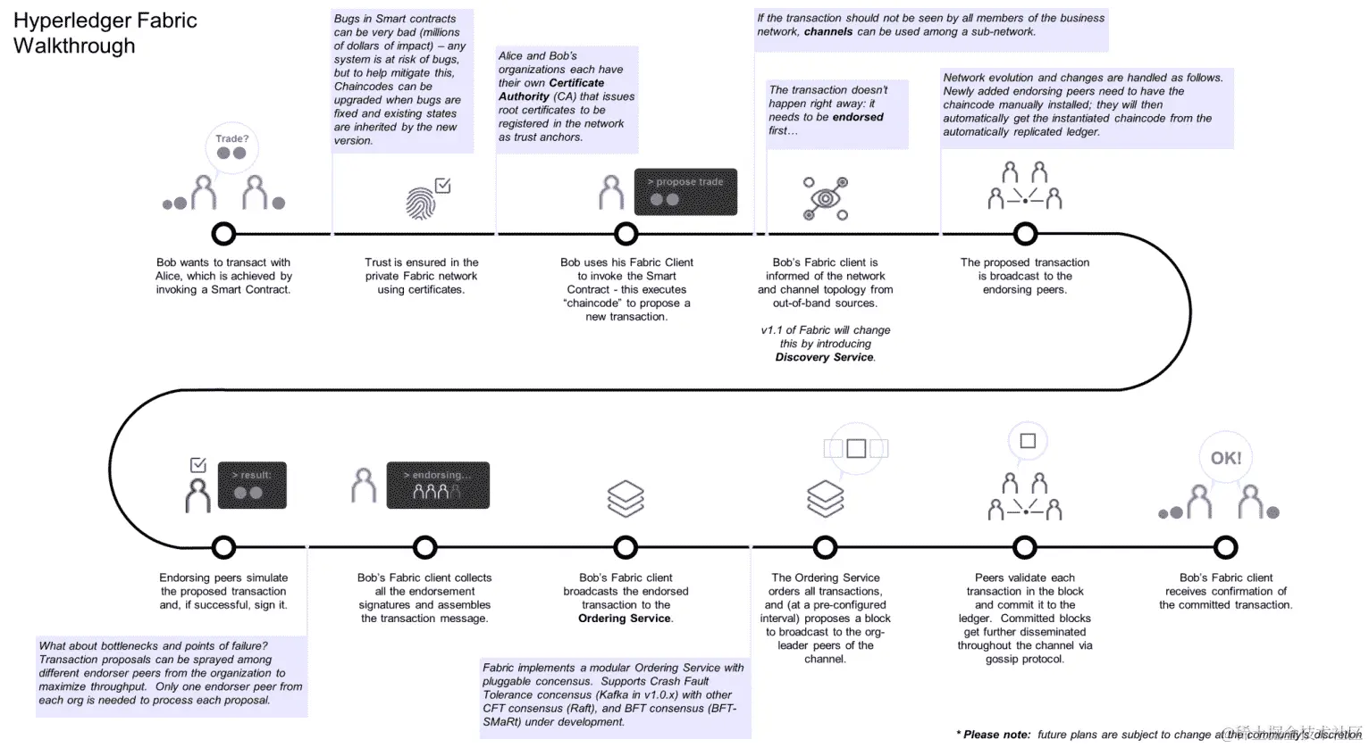 支持加密货币的区块链在公开或无许可方面,即任何人都可以参与而无需特定身份。这类区块链通常使用基于工作证明(PoW)和经济激励的共识协议。相比之下,许可区块链作为在一群已知、可识别参与者之间运行区块链的替代方式而发展。许可区块链提供了一种确保共享相同目标但不完全信任对方的实体之间相互作用的方式,例如互相交换资金、商品或信息的企业。许可区块链依赖于其对等方的身份,并通过传统的拜占庭容错(BFT)共识来实现。BFT 是一种协议,已广泛用于 IT 解决方案中,用于就网络失效节点状态达成一致。该协议基于拜占庭将军问题,即一群将军需要就他们的战略达成一致,但其中一人可能是叛徒。