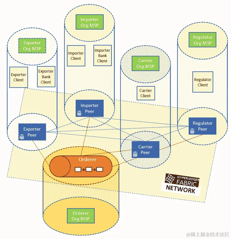 书中的代码词汇,数据库表名,文件夹名称,文件名,文件扩展名,路径名,虚拟 URL,用户输入和 Twitter 账号显示如下:"发单方属于自己的组织,被称之为 TradeOrdererOrg。"