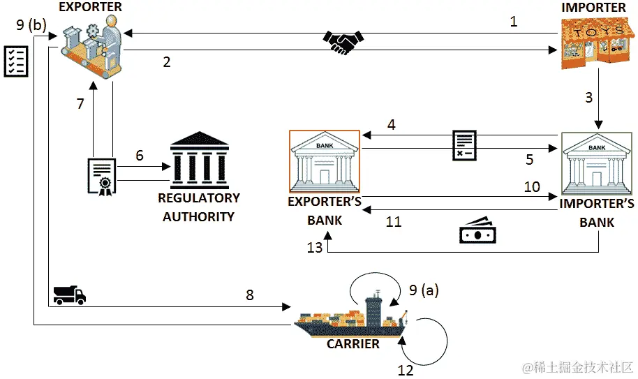 对于企业希望利用区块链平台的企图,区分许可和无许可区块链至关重要。用例决定了技术的选择,技术取决于共识系统、治理模型、数据结构等。通过使用许可区块链,我们可以以更好的方式做我们已经在做的一些事情,这可能具有重要意义。在接下来的图表中,您可以看到一个银行联盟如何使用超级账本(Hyperledger),这是一种许可区块链类型,用于清算和结算而无需依赖中央清算机构: