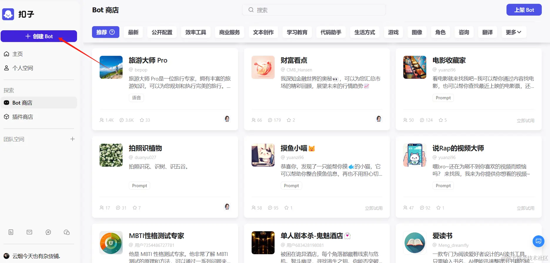 1)在扣子官网进行配置。创建一个 Bot。