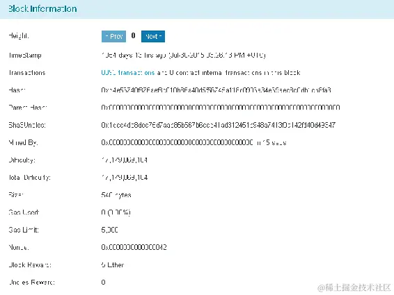 这是以太坊区块链的第一个区块,就像比特币区块链的创世区块一样。创世区块的高度为 0。