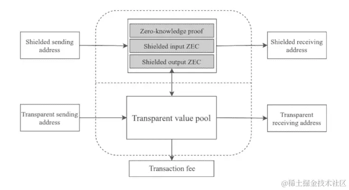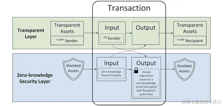 图 8.1:遮盖了 zk-SNARK 协议的 Zcash 交易输入和输出(来源:z.cash)