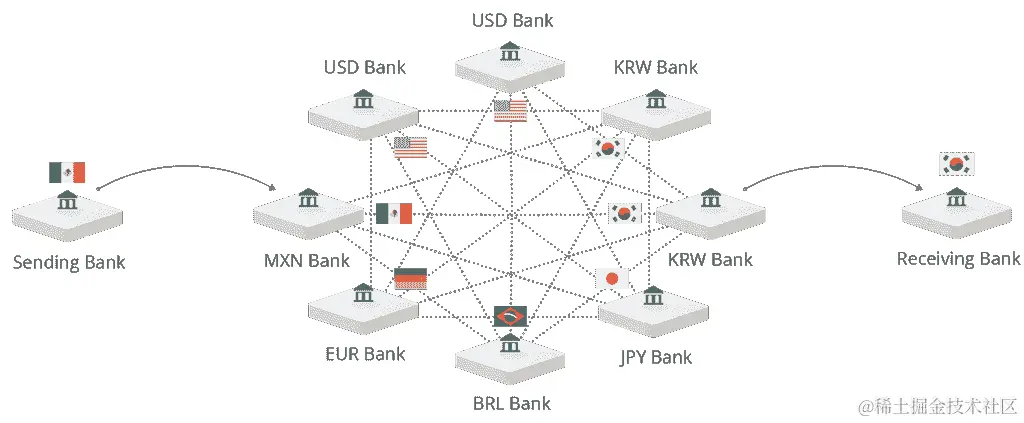 Ripple 提供了一个全球支付解决方案,这意味着可以在不同国家建立支付渠道。这使得银行能够实时结算跨境支付,实现端到端的透明度,并以低成本完成。随着 Ripple 采用的增长,货币和交易对的数量将增加,流动性提供商需要为每种货币的每个交易对维护账户: