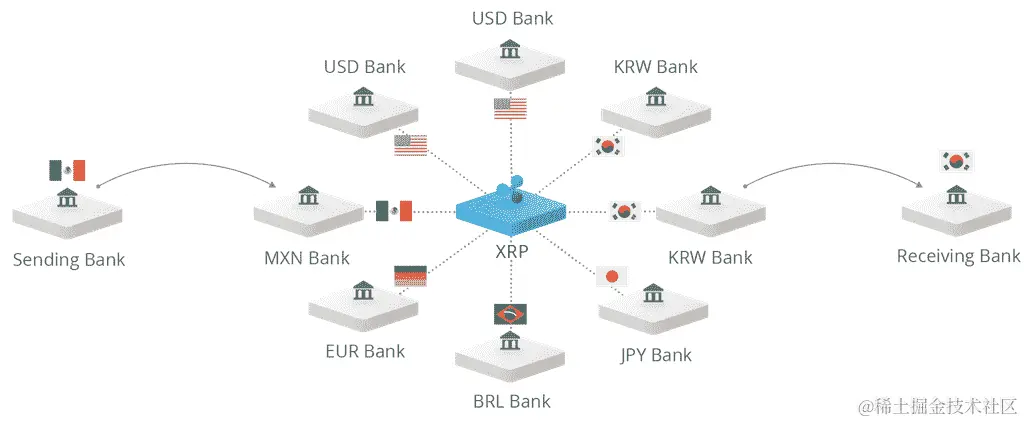Ripple 可以在任何银行之间创建一个货币对,借助 Ripple 自己的代币 XRP。与任何其他传统中介货币转换不同,XRP 不需要银行账户: