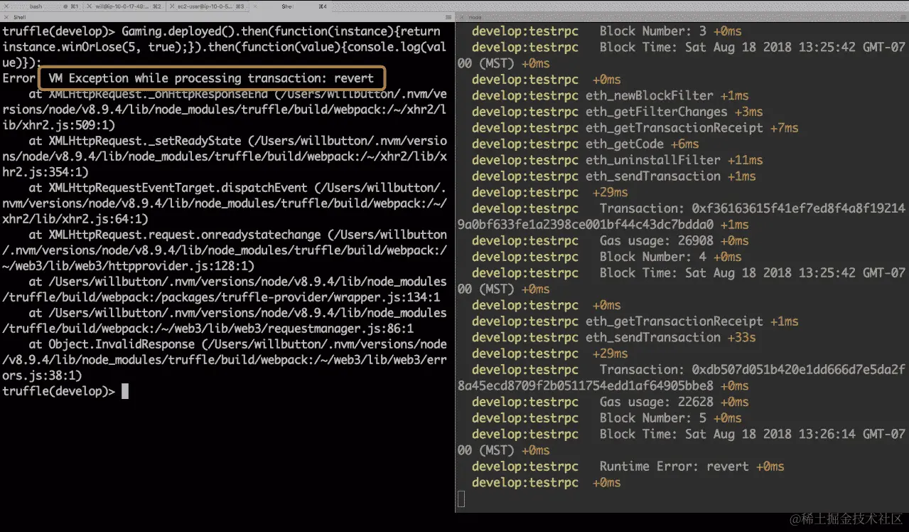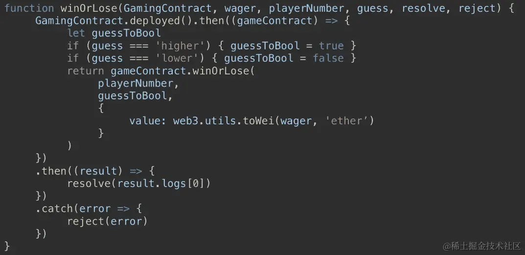 gameContract.winOrLose()函数是与我们的 Solidity 合同进行通信的实际函数。请记住,在 Solidity 中,我们始终以Wei为单位处理货币。以太坊的大多数用户都熟悉ether单位,因此在我们的界面中,我们允许他们用以太币下注,然后我们使用web3工具将其从以太币转换为 Wei,然后将其附加到我们的交易中。这整个部署的函数也是一个承诺。