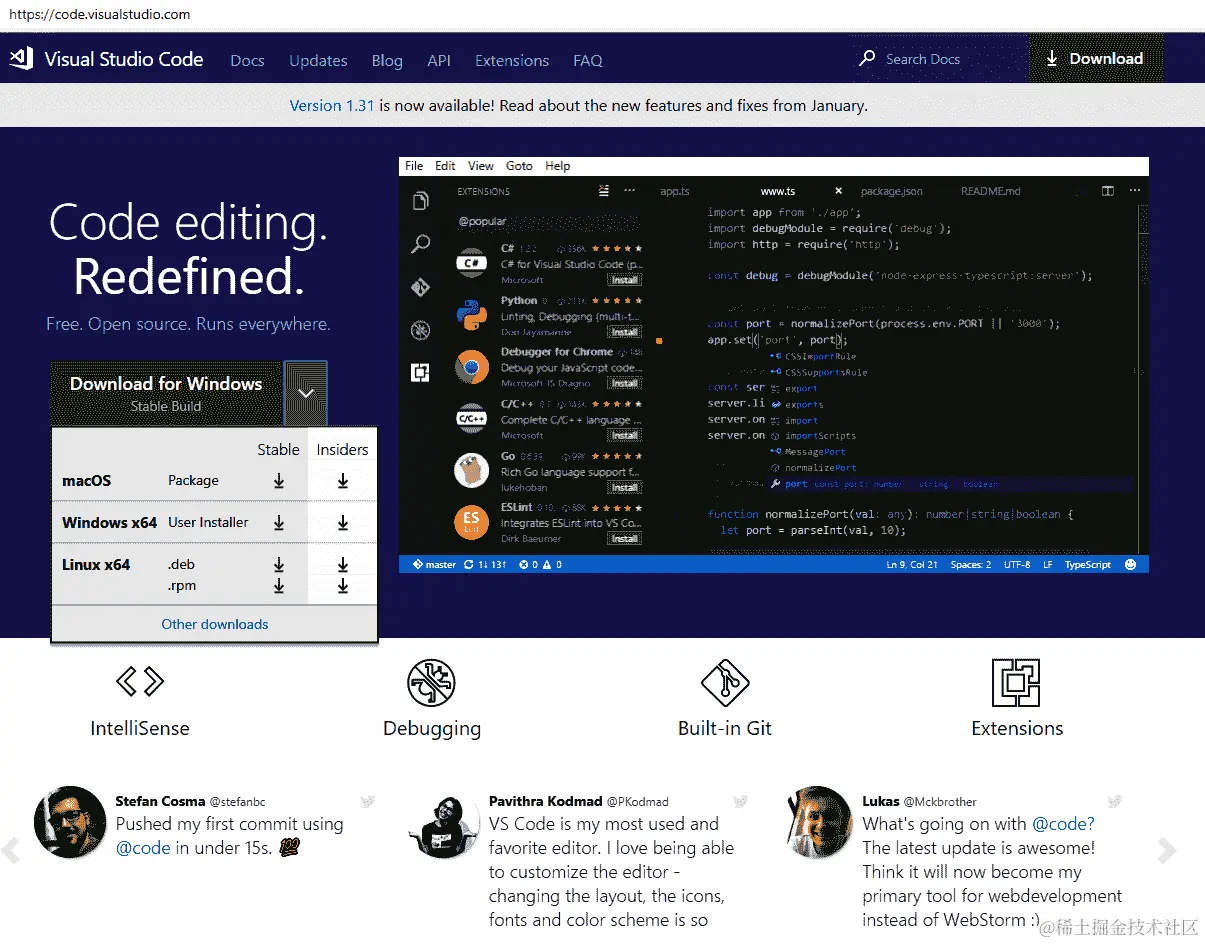 要安装它,可以访问以下网站:code.visualstudio.com/,并下载适合你操作系统的安装包。你应该看到一个类似于以下屏幕截图的首页: