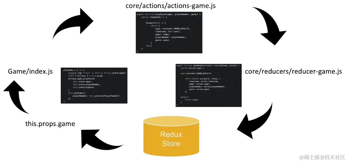 当我们从actions对象的playRound()函数到达时,我们不是要跳过它,而是要跟进它,以便通过该函数跟踪代码执行,这将带我们到我们的actions-game.js文件,我们在其中有我们的playRound()函数,返回dispatch参数。然后我们进入其中,现在它已经准备好返回我们将要分派到 reducer 的 JSON 对象。