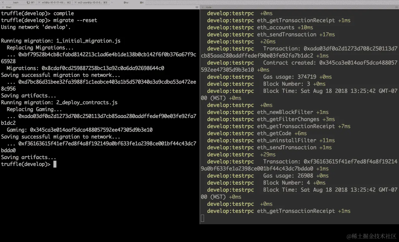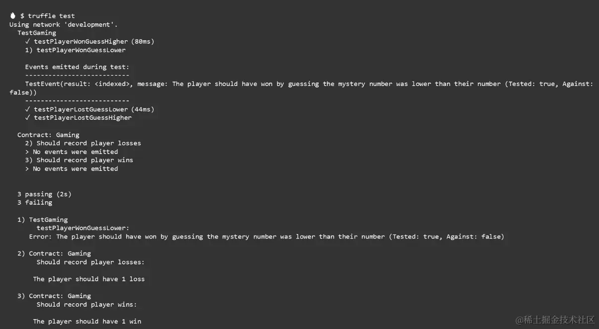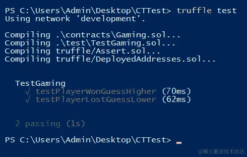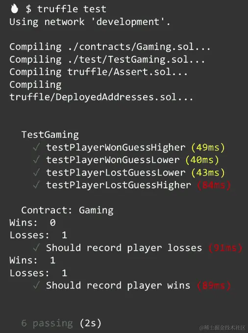 我们传递给这个函数的一个参数是GamingContract,这是我们刚刚创建的在线合约的实例。它有一个deployed方法,返回一个 promise。它的作用是获取我们合约的部署版本,这意味着它获取与以太坊网络通信所需的信息。它找出它所在的网络、它的部署地址是什么,以及如何与它通信。由于它是一个 promise,我们可以通过使用then等待其完成;这意味着我们应该执行这段代码,而每当它完成时,继续执行。
