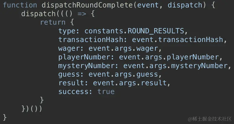 当它成功解析时,我们就会从包含我们事件的日志中返回该对象,并将其传递给另一个新函数dispatchRoundComplete(),并调用我们的参数事件。这个函数也许会让你感到熟悉:它就是我们在上一节创建的派发函数,但我们稍微修改了一下,如下图所示:
