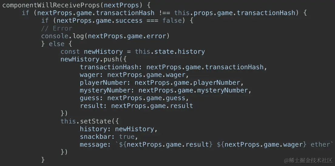我们将以一个if语句开始,检查nextProps参数中的game.transactionHash是否与this.props中的不同。如果是,那么告诉我们我们有一个新的交易哈希,而由于交易哈希特定于一个交易,我们知道玩家已经完成了一轮游戏。接下来,我们设置我们的success键;记住,这是我们设置为true的键,如果包裹我们的合同交易的 promise 成功完成,我们设置为false,如果 promise 被拒绝。这给了我们一个机会来传递错误消息,如果我们需要的话。如果我们的 promise 成功解决,那么我们将有一些新的交易细节添加到我们的游戏历史窗口中。我将该游戏历史存储为组件状态中的一个数组。