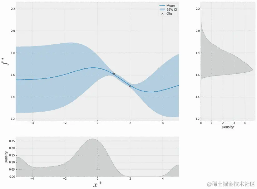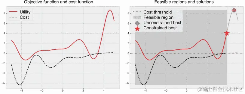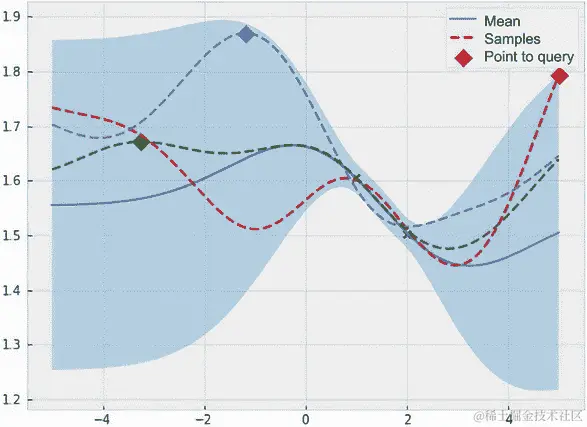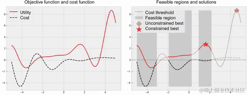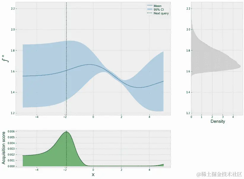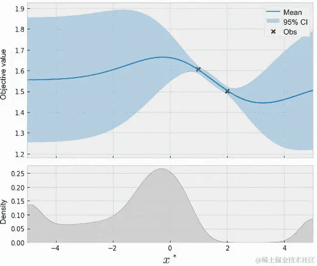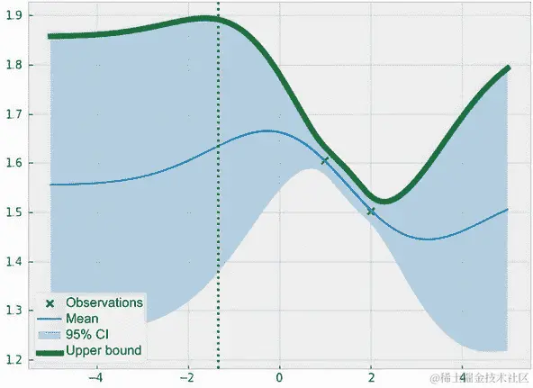 具体来说,我们知道给定位置的目标值遵循正态分布,而量化正态分布不确定性的常用度量是 95% CI,其中包含分布的 95% 的概率质量。使用 GP,我们将该 95% CI 在输入空间中可视化为图 5.6 中粗线。该 95% CI 的上限,也就是图 5.6 中突出显示的阴影区域的上边界,正是 UCB 策略将用作搜索空间中数据点的获取分数的上边界,并且给出最高分数的点是我们将评估下一个目标函数的位置,这在本例中是由虚线围绕的位置约为 –1.3。