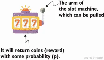 拉动老虎机的手臂时,你可能会得到硬币作为奖励;但是,这个过程中存在随机性。具体来说,在这台老虎机的内部机制中编程了一个奖励概率p。每次拉动机器的手臂时,机器都会根据该概率返回硬币。这台老虎机在图 5.1 中可视化。如果p=0.5,则该机器向其玩家奖励一半的时间。如果p=0.01,则大约只有 100 次拉动中的 1 次会导致返回硬币。由于这个概率被编程在机器内部——因此隐藏在我们看不见的地方——我们无法确定这个概率是多少。