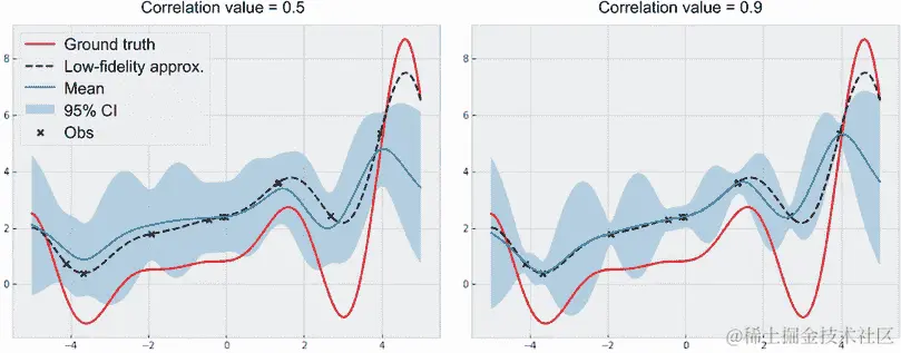 基于可以处理训练数据点的相关性值的内核,可以对多保真度数据集进行训练,我们可以使用多保真度变体的 Matérn 内核来完成此任务。GP 对于预测的不确定性取决于每个观测点所来自的函数,以及如果它来自于低保真度函数,则该函数的相关性值如何。