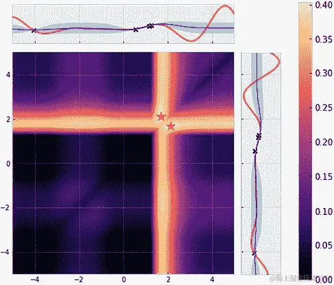 注意有趣的是,在β → ∞的极限情况下,最大化 UCB 获取分数的点是使标准差σ最大化的点,即我们的不确定性最大化的点。这种行为对应纯粹的探索性,因为我们选择具有高度不确定性的数据点。