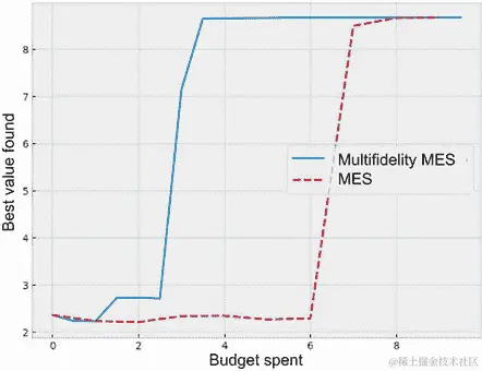 图 9.14 后验均值最大化器的目标值作为两种 BayesOpt 策略花费预算的函数。在这里,多保真度 MES 明显优于单保真度版本。