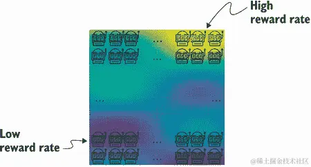 图 5.3 一个展示探索-利用困境的 MAB 数据集示例。MAB 策略必须在一个成功率持续高的机器和一个奖励率不确定的机器之间做出选择。