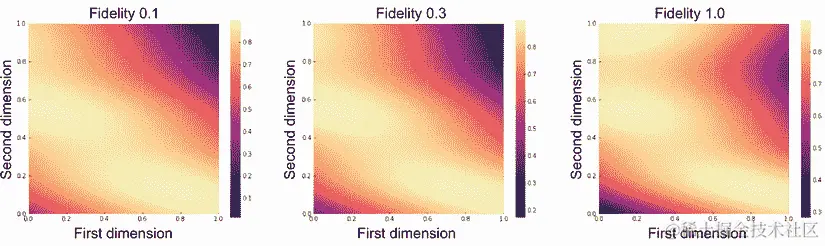 这三个函数在图 9.15 中可视化,明亮的像素表示高目标值。我们可以看到,两个低保真度的近似都遵循地面真相展示的一般趋势,并且与真实情况的相似程度随着保真度值的增加而增加。也就是说,保真度为 0.3 的第二个近似(中间)与真实的目标函数(右侧)更相似,比保真度为 0.1 的第一个近似(左侧)更相似。