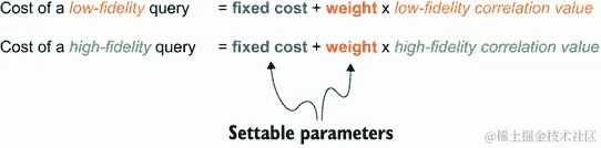 我们使用线性模型来编码优化过程中每个保真度的查询成本。通过设置此模型的参数-固定成本和权重,我们可以建模查询成本与数据质量之间的正相关关系。也可以使用 BoTorch 实现非线性成本模型。