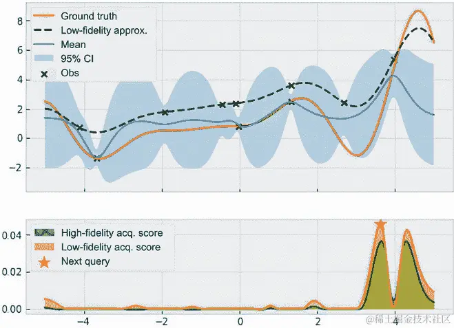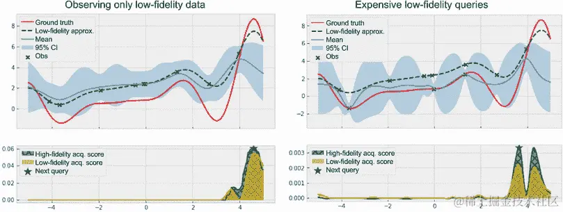 在多保真度优化中,高保真度函数提供确切的信息,但评估代价高,而低保真度函数查询成本低,但可能提供不准确的信息。在优化循环的每次迭代中,我们需要决定在哪里和哪个函数进行查询,以尽快找到目标函数的最优值。
