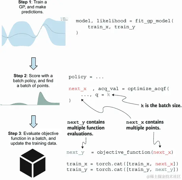 在充分讨论了 UCB 的动机和数学之后,我们现在学习如何使用 BoTorch 实现该策略。我们在这里看到的代码包含在 CH05/01 - BayesOpt loop.ipynb 中。请记住,虽然我们可以手动实现 PoI 策略,但声明 BoTorch 策略对象,将其与 GP 模型一起使用,并使用 BoTorch 的辅助函数 optimize_acqf() 优化获取分数,这样可以更轻松地实现我们的贝叶斯优化循环。
