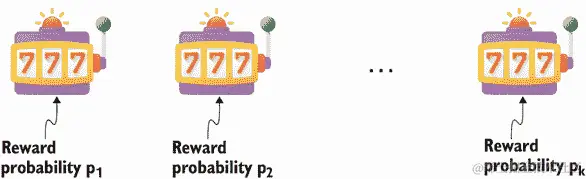 现在,想象一下,不只是一个老虎机,而是一排我们可以选择玩的老虎机,每个都有自己的奖励概率p,如图 5.2 所示。