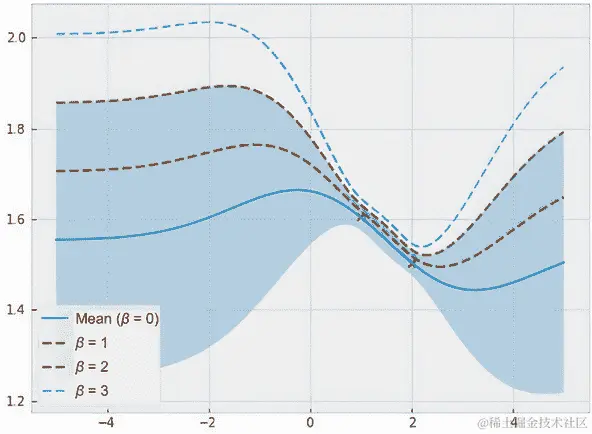 注意 BoTorch 的文档通常显示 UCB 的 β = 0.1,而许多使用 UCB 进行贝叶斯优化的研究论文选择 β = 3。所以,如果你更偏向利用,0.1 可以是你使用该策略的首选值,如果你更倾向于探索,3 应该是默认值。