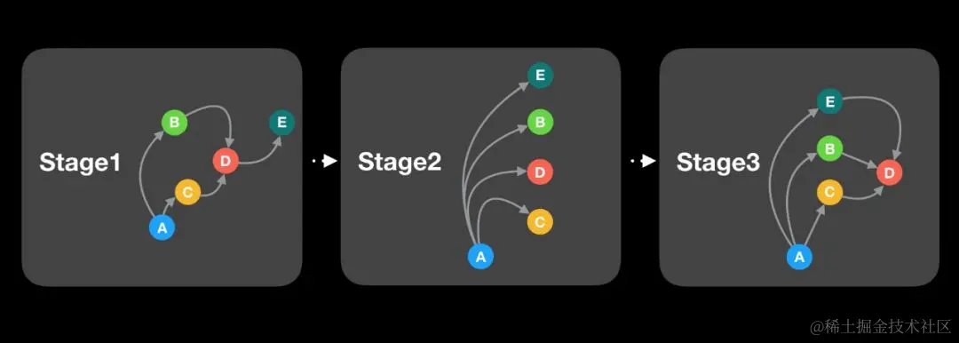从 Spark 的 DAGScheduler 中领悟到它的核心思想,面向阶段调度(Stage-Oriented Scheduler):把应用划分成一个个的阶段(Stage),再把任务(Task)安排到各个阶段中去,任务的编排则是通过构建 有向无环图(DAG),把任务依赖通过图的方式梳理得 井井有条。因为它分阶段执行,先集中资源把阶段一搞定,再齐心协力去执行阶段二,这样即能控制拥塞,又能保证时序,还能并发执行,让设备性能尽可能得到发挥,岂不美哉: