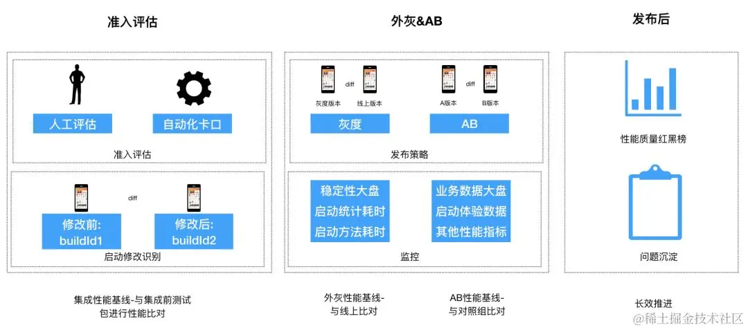 第三个维度-流程: 通过指标定义, 以及对应指标数据的自动化采集,我们可以在发布前、发布中、发布后的全研发流程中对应用的用户体感性能进行评估。