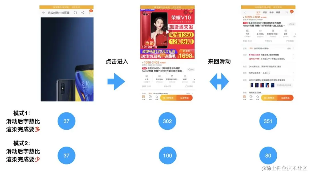 - 可交互时长:页面渲染完毕后立即开始滑屏操作,页面能响应滑屏事件那一刻即为可交互时长。