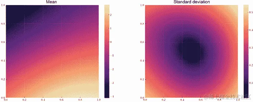 plt.imshow()将均值和标准差向量可视化为热图,确保将这两个向量重塑为方阵:c = ax[0].imshow( predictive_mean.detach().reshape(101, 101).transpose(-1, -2), origin="lower", extent=[0, 1, 0, 1], ) ❶ c = ax[1].imshow( predictive_stddev.detach().reshape(101, 101).transpose(-1, -2), origin="lower", extent=[0, 1, 0, 1], ) ❷ plt.colorbar(c, ax=ax[1])❶ 预测均值的热图