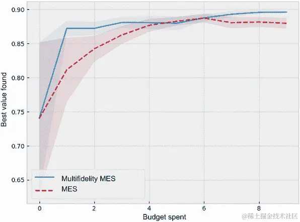 在我们的优化问题上运行多保真度 MES 策略及其单保真度版本,并使用练习 1 中描述的方法绘制每个策略的平均优化进展和误差条。图 A.19 显示了两种策略之间的比较。