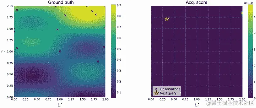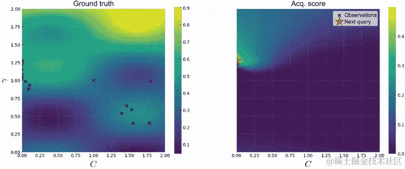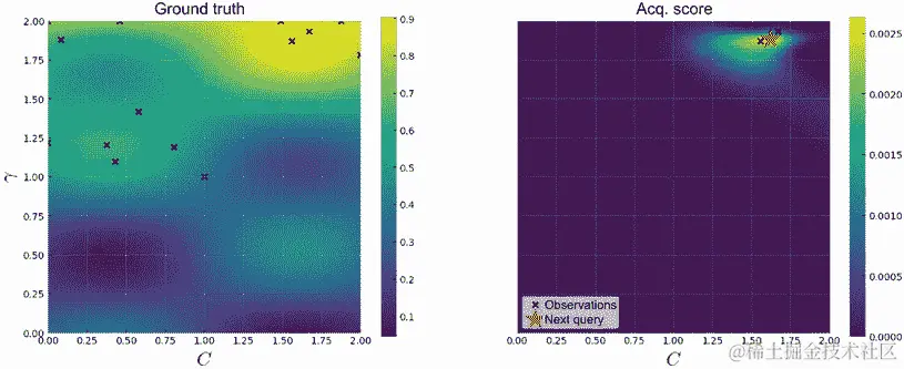 c = ax[1].imshow( ❶ acquisition_score.reshape(101, 101).T, ❶ origin="lower", ❶ extent=[lb, ub, lb, ub] ❶ ) ❶ ax[1].set_xlabel(r"$C$", fontsize=20) plt.colorbar(c, ax=ax[1])❶ 显示获取分数的热图