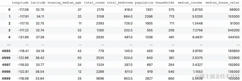 import pandas as pd df = pd.read_csv("../data/housing.csv")将 Pandas dataframe 读入后,应该与图 A.21 中的输出类似。