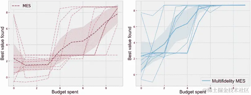 在我们的优化问题上运行多保真度 MES 策略及其单保真度版本。