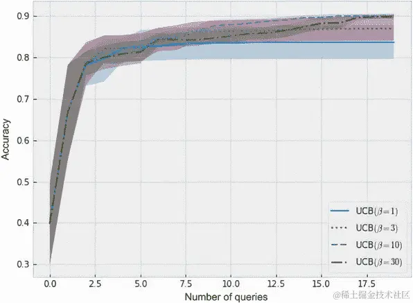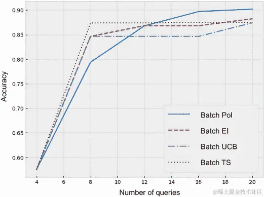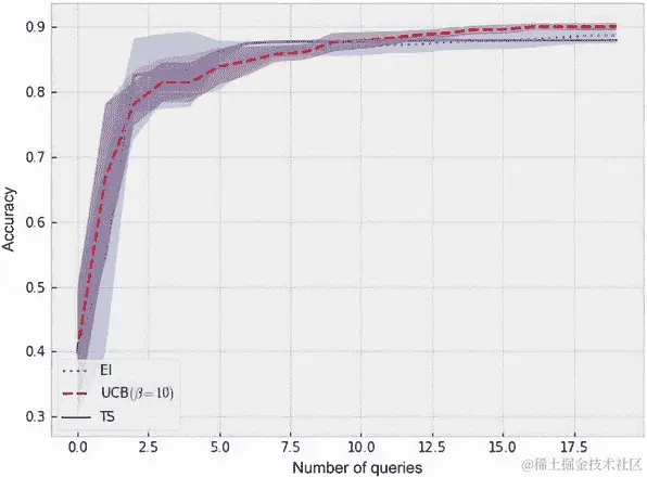 从 Sobol 序列中绘制的候选者数量设置为 5,000,并在使用辅助函数优化给定策略的收购分数时,使用 100 次重启和 500 次原始样本: