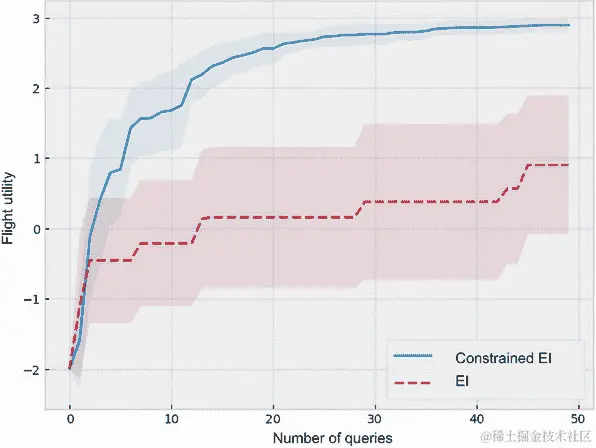policy = botorch.acquisition.analytic.ExpectedImprovement( model=utility_model, best_f=train_utility.max(), )图 A.16 显示了我们实现的两个先前策略获得的优化结果。我们看到,受限 EI 通过考虑我们施加的成本约束完全支配了常规 EI 策略。