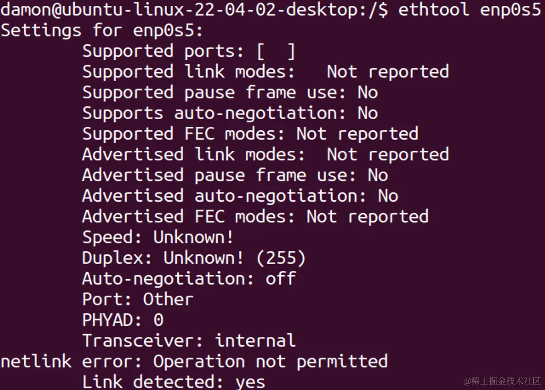 基本 ethtool 命令显示指定网卡(enp0s5)的当前硬件设置。