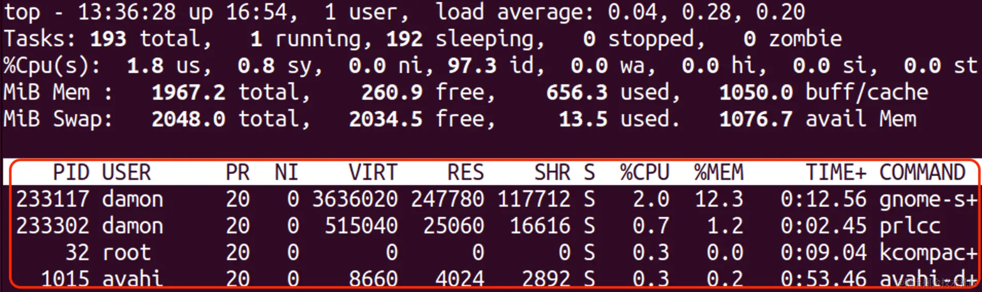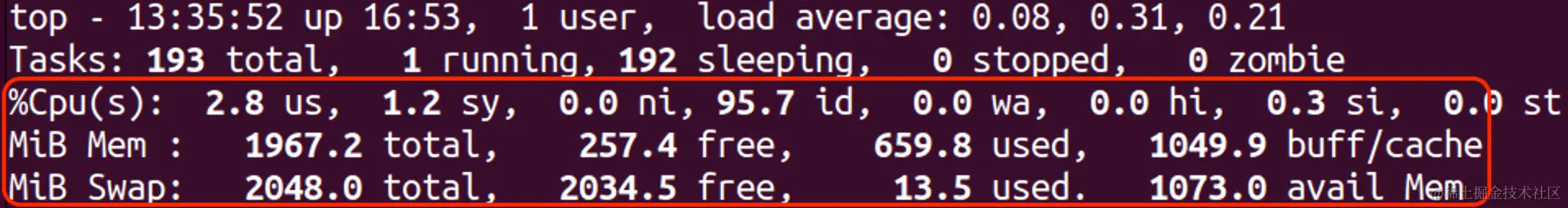 标准的 Linux 硬件监控工具是 top。它在上方框中显示基本的硬件信息,在下方部分中显示系统进程及其 CPU 和内存消耗的动态表。