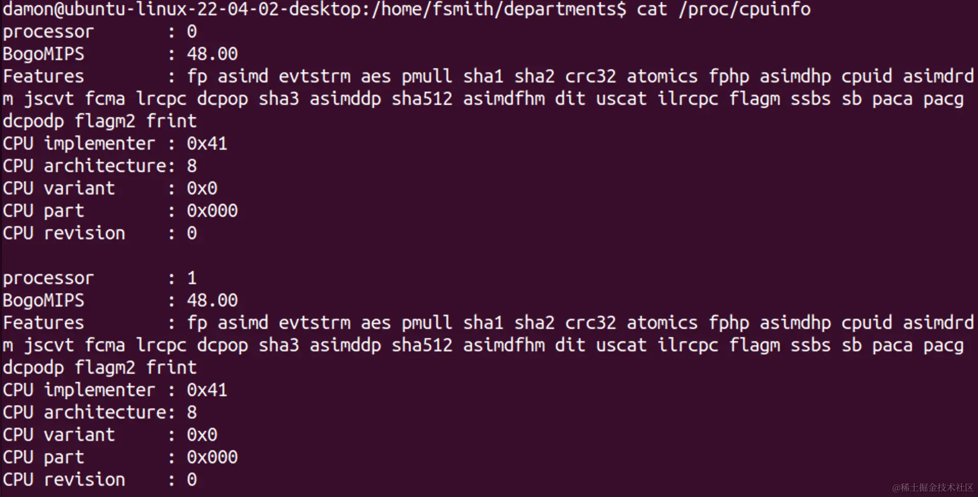 输出显示了两个 CPU 内核(0 和 1),以及功能和架构信息。此屏幕截图来自虚拟机,不显示处理器型号或规格。