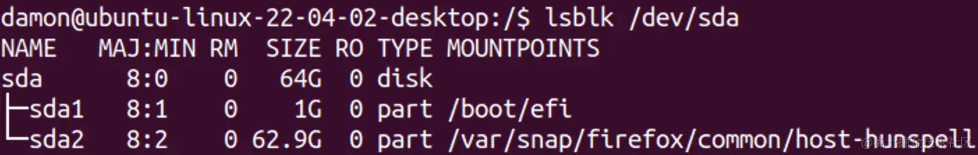 你可以使用 lsblk 命令显示类似的信息。你可以将该命令指向特定存储磁盘,例如 /dev/sda。