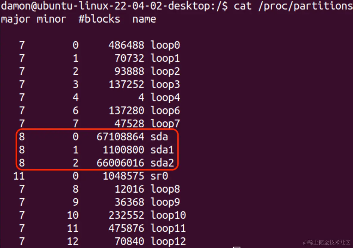 使用与上面用于 CPU 和内存数据的相同 cat 命令显示分区信息。参数是 /proc/partitions。