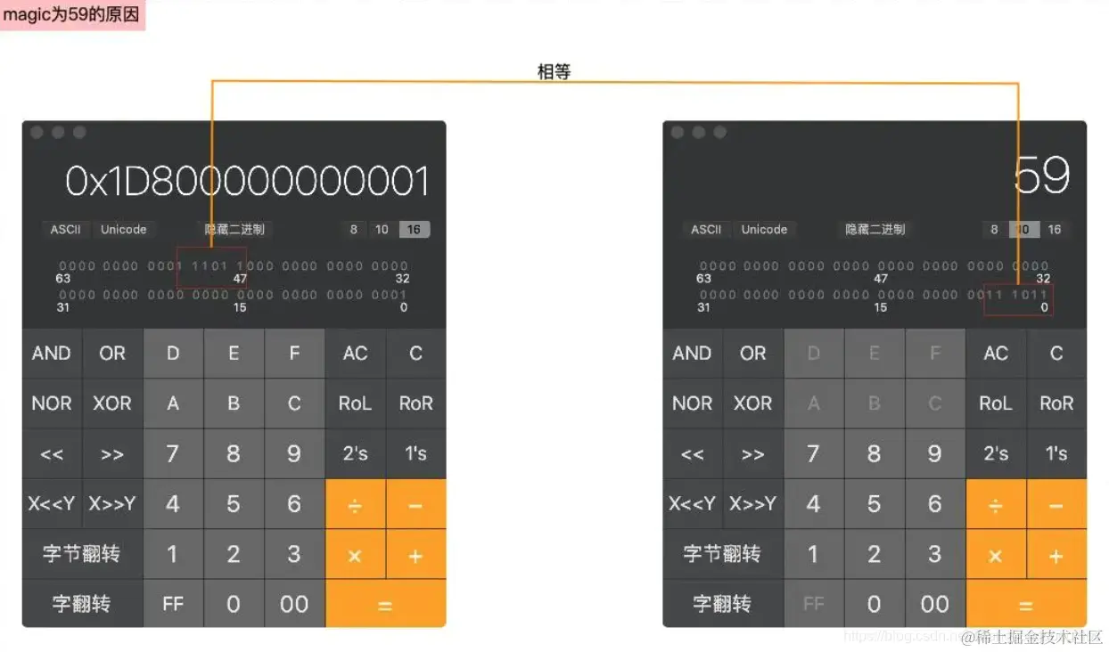 magic是59是由于将isa指针地址转换为二进制,从47(因为前面有4个位域,共占用47位,地址是从0开始)位开始读取6位,再转换为十进制,如下图所示