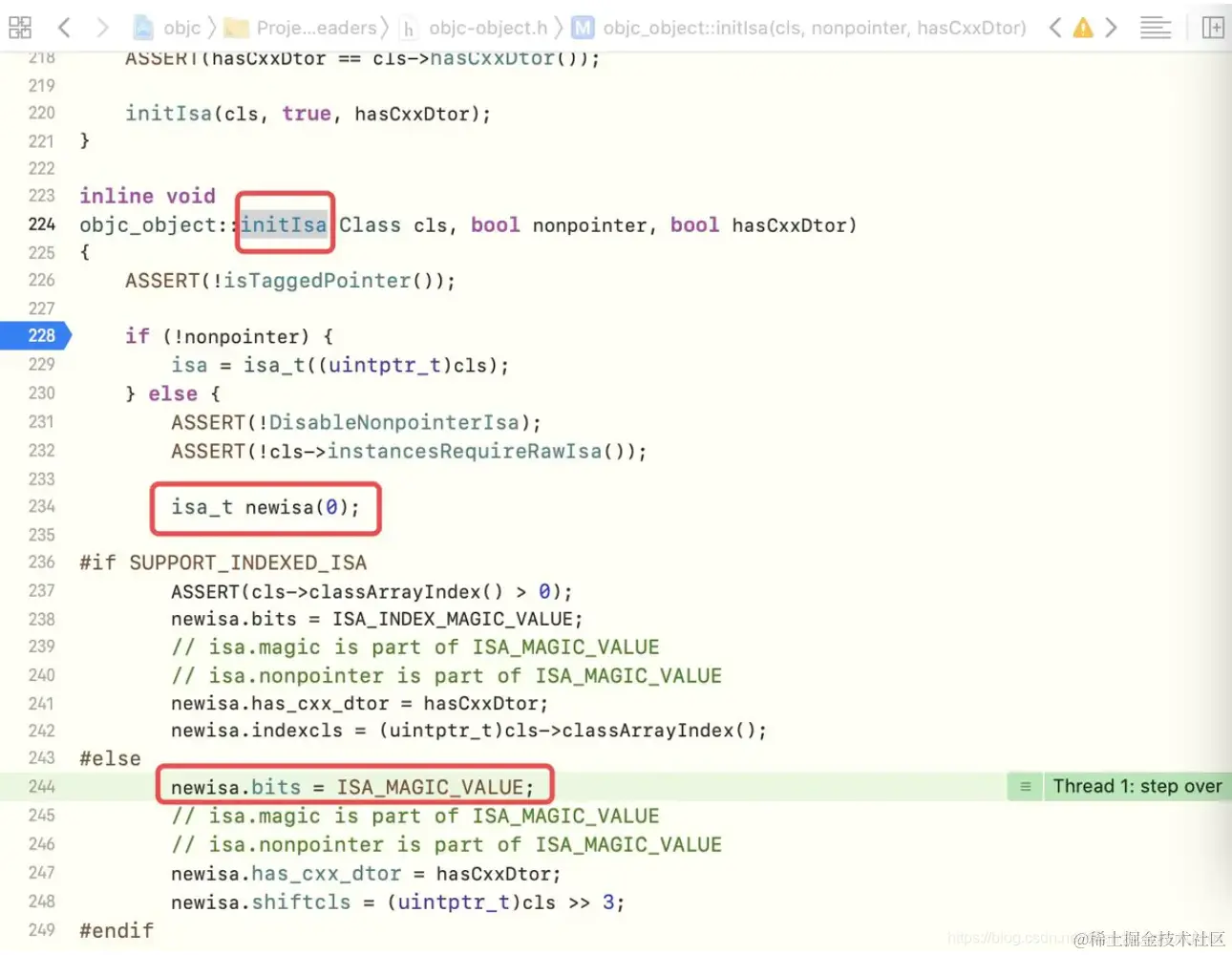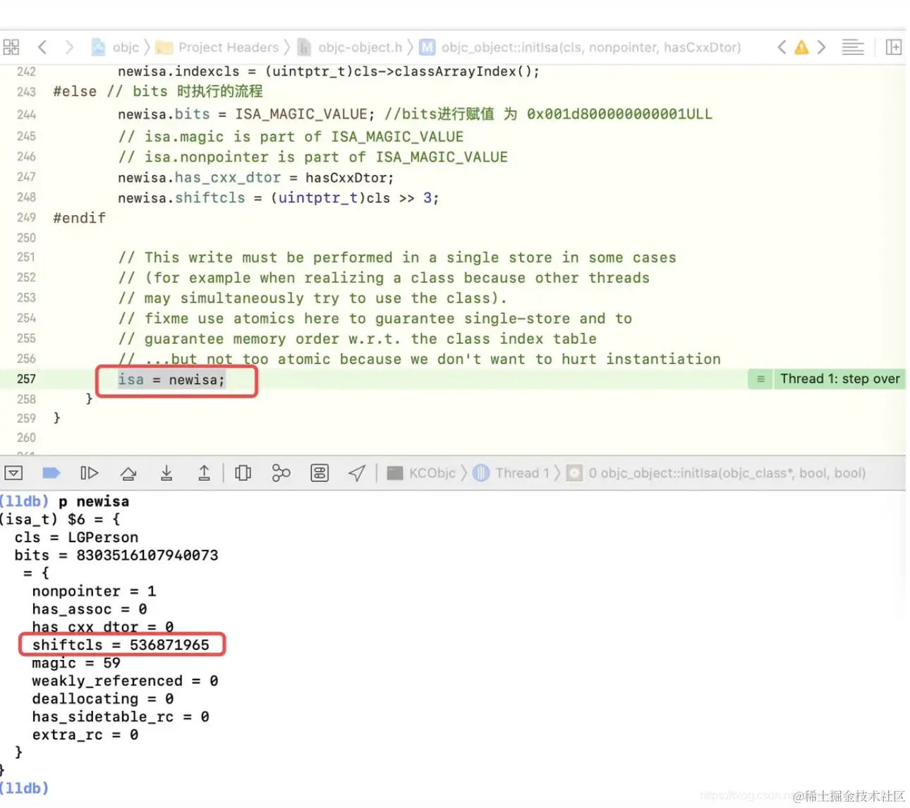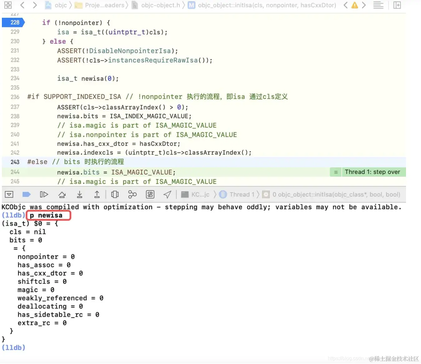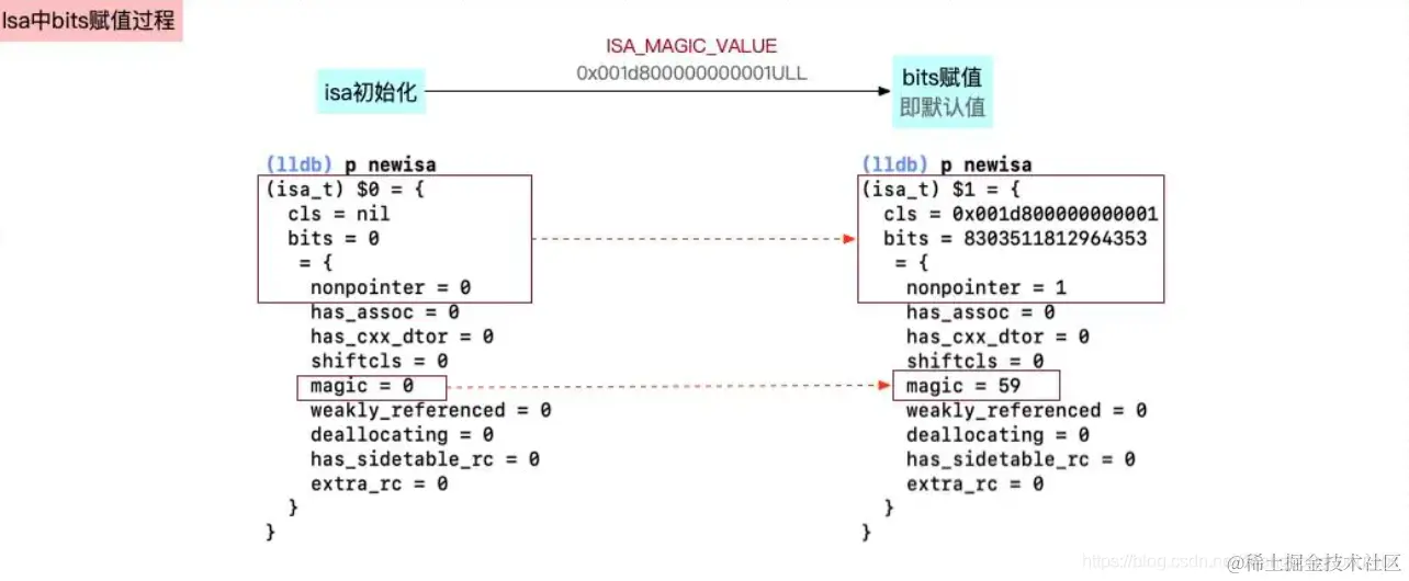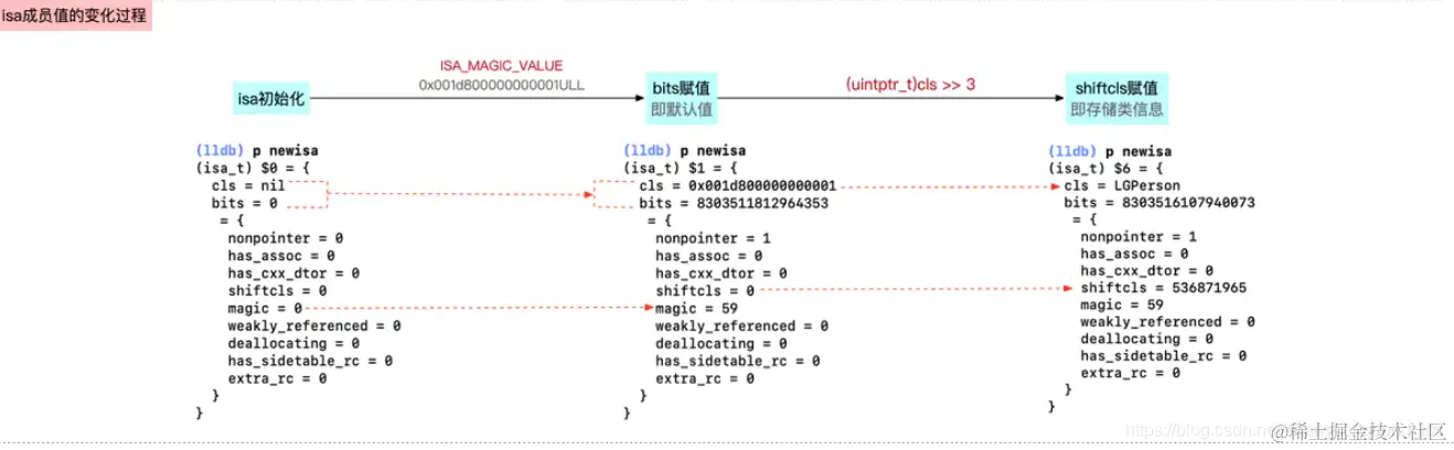 newisa.bits = ISA_MAGIC_VALUE;下一行,表示为isa的bits成员赋值,重新执行lldb命令p newisa,得到的结果如下通过与前一个newsize的信息对比,发现isa指针中有一些变化,如下图所示
