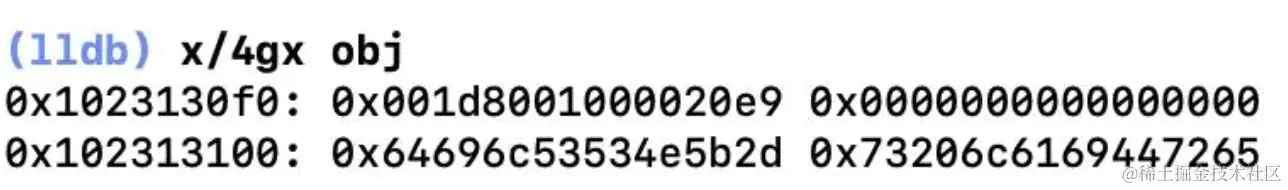 x/4gx obj,得到isa指针的地址0x001d8001000020e9 -