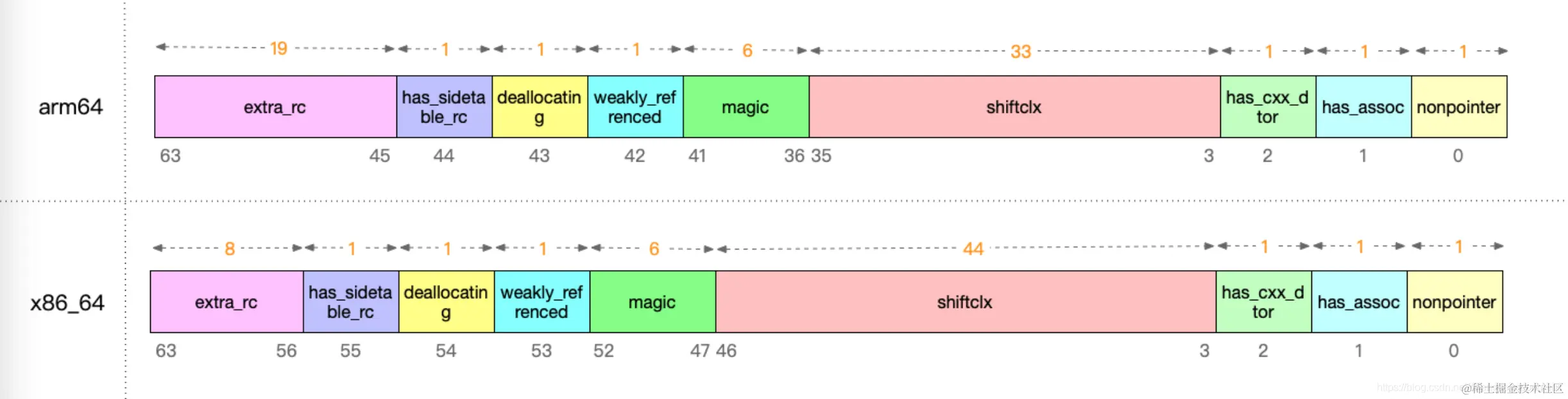 引用计数为10,那么extra_rc为9(这个仅为举例说明),实际上iPhone 真机上的extra_rc是使用 19位来存储引用计数的