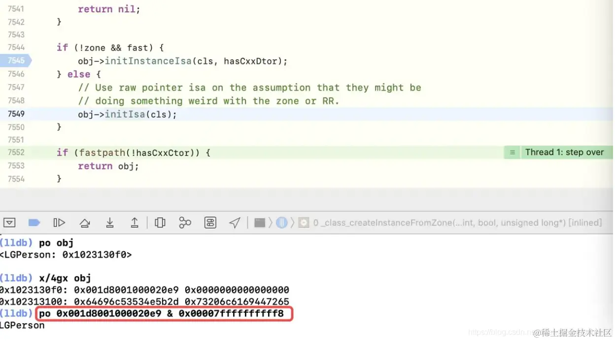 _class_createInstanceFromZone方法。通过x/4gx obj得到obj的存储信息,当前类的信息存储在isa指针中,且isa中的shiftcls此时占44位(因为处于macOS环境) -