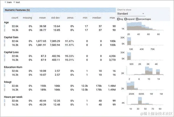 在本章的前面,我们描述了偏斜的概念,即一个数据集与另一个数据集之间的分布差异。当将训练好的模型部署到生产中时,这是机器学习实践者面临的主要问题之一。检测偏斜涉及对数据集的分布进行建模并比较它们是否匹配。快速查看数据集统计信息的简单方法是使用像 Facets(pair-code.github.io/facets/)这样的工具。参见图 6.5 以查看截图。Facets 将分析和总结您的数据集,以便您查看每个特征的分布,这将帮助您快速发现数据集之间的不同分布问题。