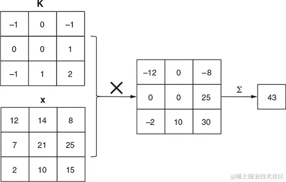 图 4.4. 在 2D 卷积操作中的点积(即乘加)操作的示意图,这是图 4.3 中概述的完整工作流程中的一步。为了说明方便,假设图像块(x)只包含一个颜色通道。图像块的形状为[3, 3, 1],与卷积核切片(K)的大小相同。第一步是逐元素相乘,产生另一个[3, 3, 1]张量。新张量的元素被加在一起(由σ表示),和即为结果。