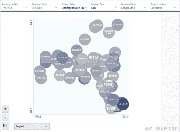 图 6.6. Facets 的另一张截图,这次探索的是数据-csv 示例中的纽约州校园数据集。在这里,我们看到 Facets Dive 视图,它允许您探索数据集的不同特征之间的关系。每个显示的点都是数据集中的一个数据点,这里我们将点的 x 位置设置为 Latitude1 特征,y 位置是 Longitude1 特征,颜色与 Undergraduate Enrollment 特征相关,前面的字是设置为 City 特征的,其中包含每个数据点所在的城市的名称。从这个可视化中,我们可以看到纽约州的大致轮廓,西边是布法罗,东南边是纽约。显然,Selden 市包含了一个根据本科生注册人数计算的最大校园之一。