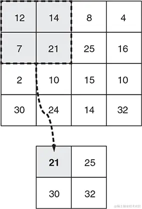 图 4.5. maxPooling2D 层的工作原理示例。此示例使用一个小的 4 × 4 图像,并假设 maxPooling2D 层配置为poolSize为[2, 2]和strides为[2, 2]。深度维度未显示,但 max-pooling 操作独立地在各维度上进行。